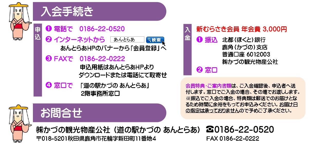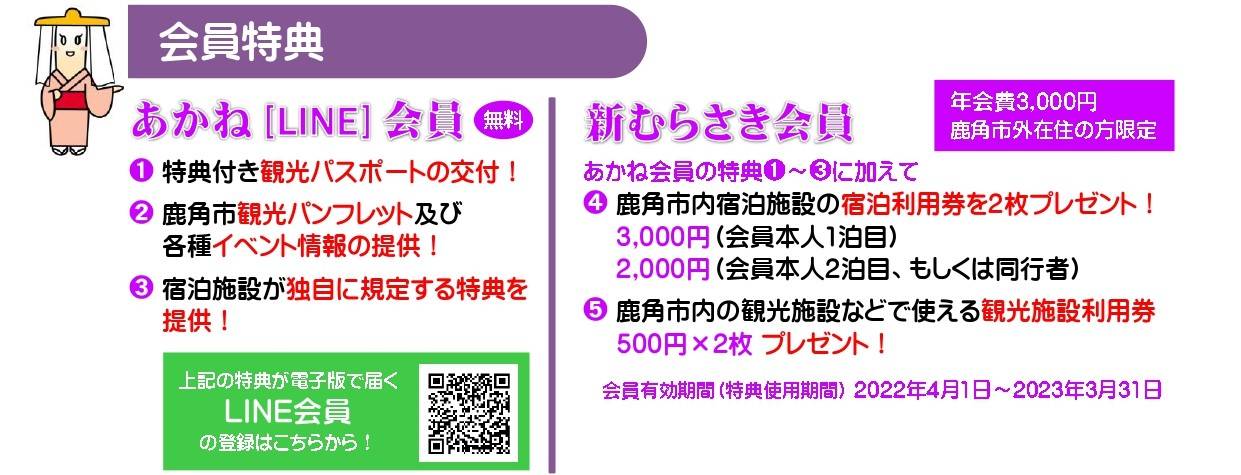 鹿角(かづの)観光ファンとは、『鹿角が好き』『鹿角をもっと深く知りたい』『鹿角のためになんとかしたい』という思いを持った方を対象にした会員制度です。鹿角市の観光・イベント・お得な情報などをお知らせする「鹿角観光ファン通信」を定期的にお届けするほか、鹿角市内施設で、さまざまな特典を受けることが出来ます。誰でも無料で登録が出来る「あかね会員」と鹿角市外にお住まいの方限定の「新むらさき会員」(年会費3000円)の二種類があります。